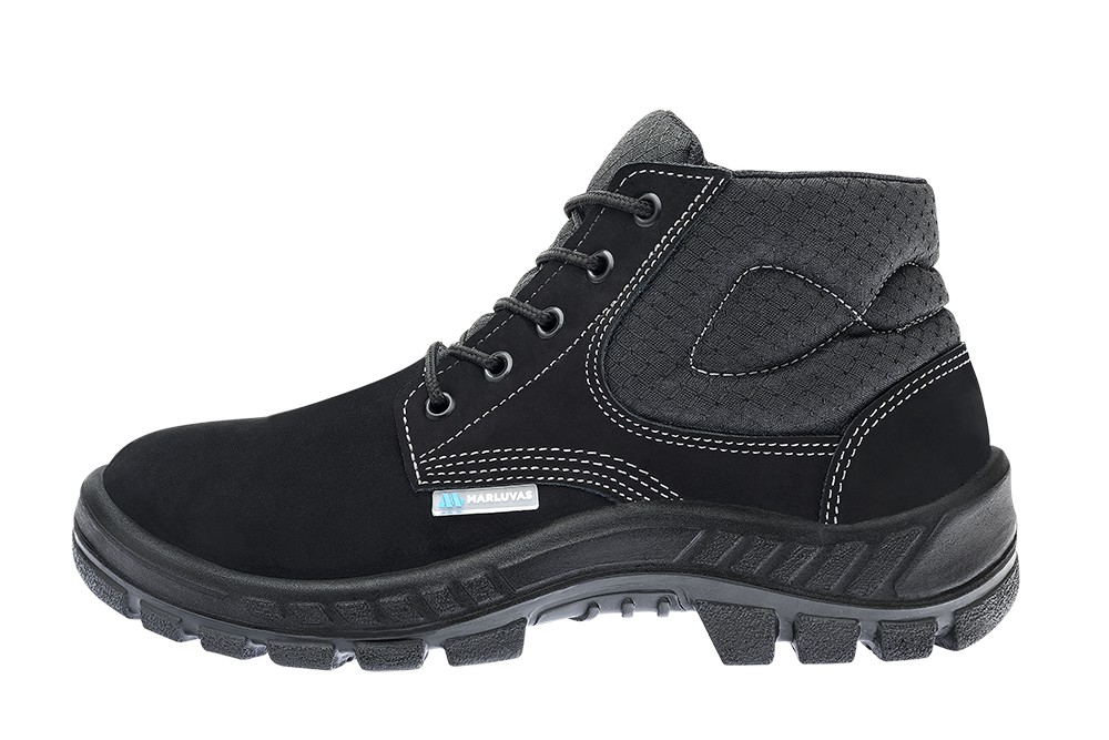 Bota de segurança confeccionada em couro nubuck cor preta, indicada para áreas administrativas, aventuras, mecânicas, montadoras, motoboys e prestadoras de serviços. Este calçado tem estrutura fibrosa e microporosa, que ajuda a manter a temperatura dos pés, colarinho e lingueta soft acolchoados. Ele apresenta fechamento em cadarço, solado isolante em PU bidensidade, injetado diretamente no cabedal, e palmilha de montagem em poliéster resinado com biqueira de polipropileno.